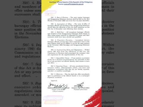 AN ACT SETTING THE TERM OF OFFICE OF BARANGAY OFFICIALS AND MEMBERS OF THE SANGGUNIANG KABATAAN, AND FOR OTHER PURPOSES Be it enacted by the Senate and House of Representatives of the Philippines in Congress assembled: SECTION 1. Term of Office. - The term of office of all elected barangay and Sangguniang Kabataan officials shall be four (4) years. No elective barangay official shall serve for more than three (3) consecutive terms in the same position. No elective Sangguniang Kabataan official shall serve for more than one (1) term in the same position. Voluntary renunciation of office for any length of time shall not be considered as an interruption in the continuity of service for the full term for which the elective official was elected.